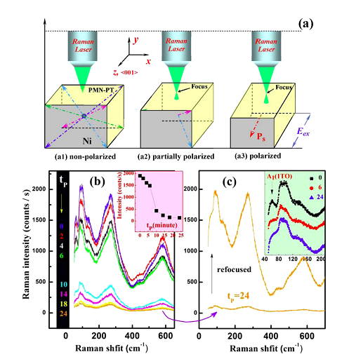 不同电场下Ni/PMN-PT薄膜拉曼光谱原位测试(a)及电场对样品拉曼光谱的调制(b、c)