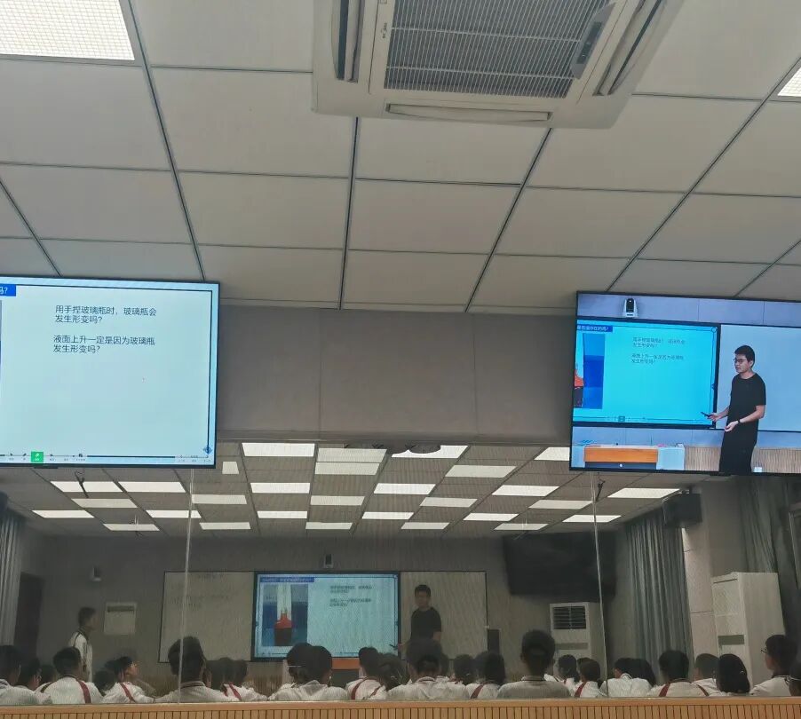 实习老师黄建聪以鲁科版必修一第三章第二节《科学探究:弹力》为教学内容,带来了一节结构清晰、互动充分的物理课。课堂上,黄建聪通过问题引导、小组互动、实物演示等多种方式,从生活中常见的形变现象入手,通过橡皮泥、弹簧、卡皮巴拉车等教具,利用玻璃瓶微小形变演示、激光笔反射实验等,引导学生掌握物理知识和物理方法——“放大法”。