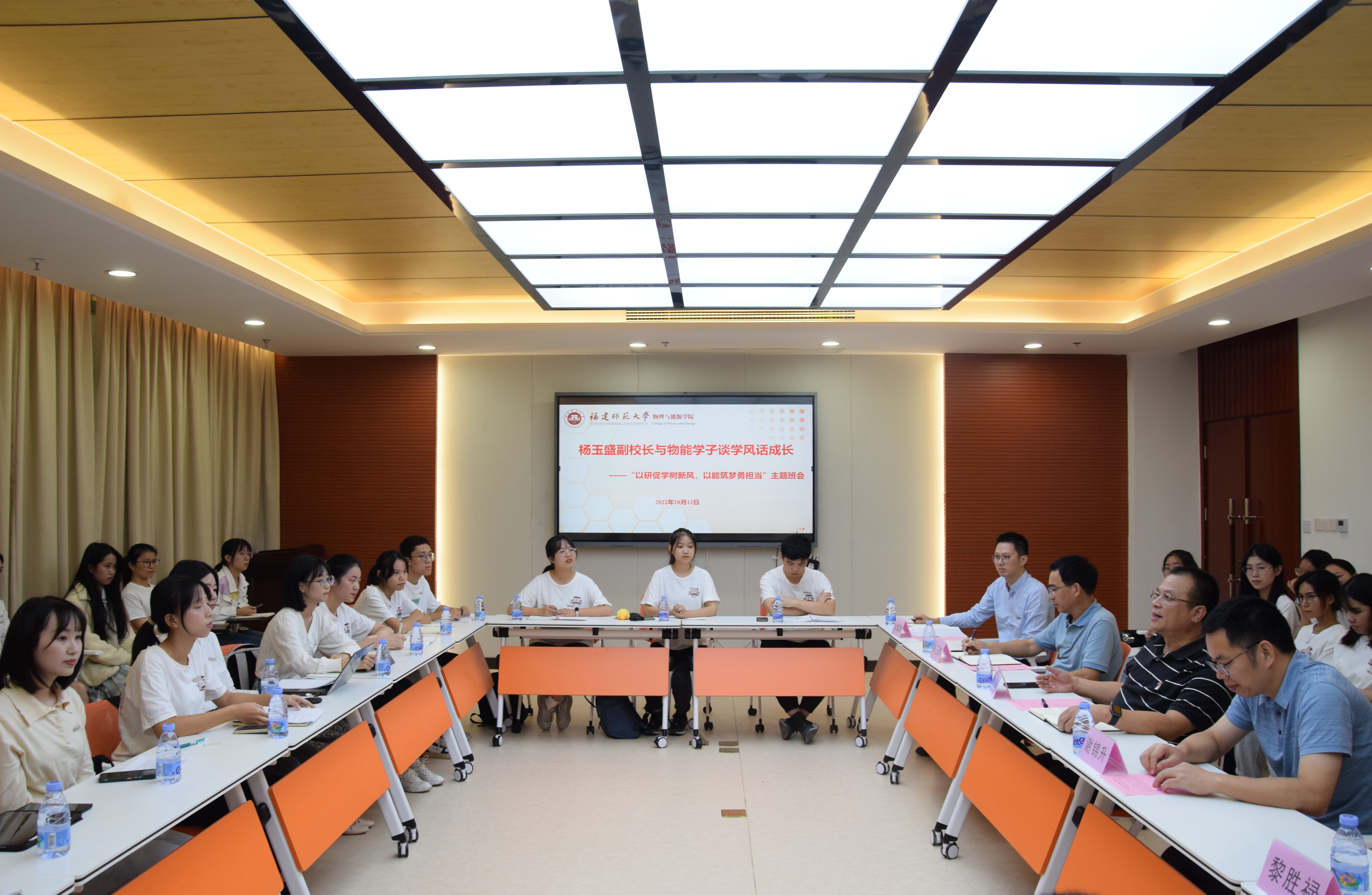 10月12日,杨玉盛副校长走进联系班级——我院2020级物理学一班,参加“以研促学树新风,以能筑梦勇担当”学风建设主题班会。科学技术处副处长谢锦升,学院党委书记林玉辉、副书记黎胜禄,班主任张健敏、各年级辅导员以及物理学一班全体同学参加了班会。