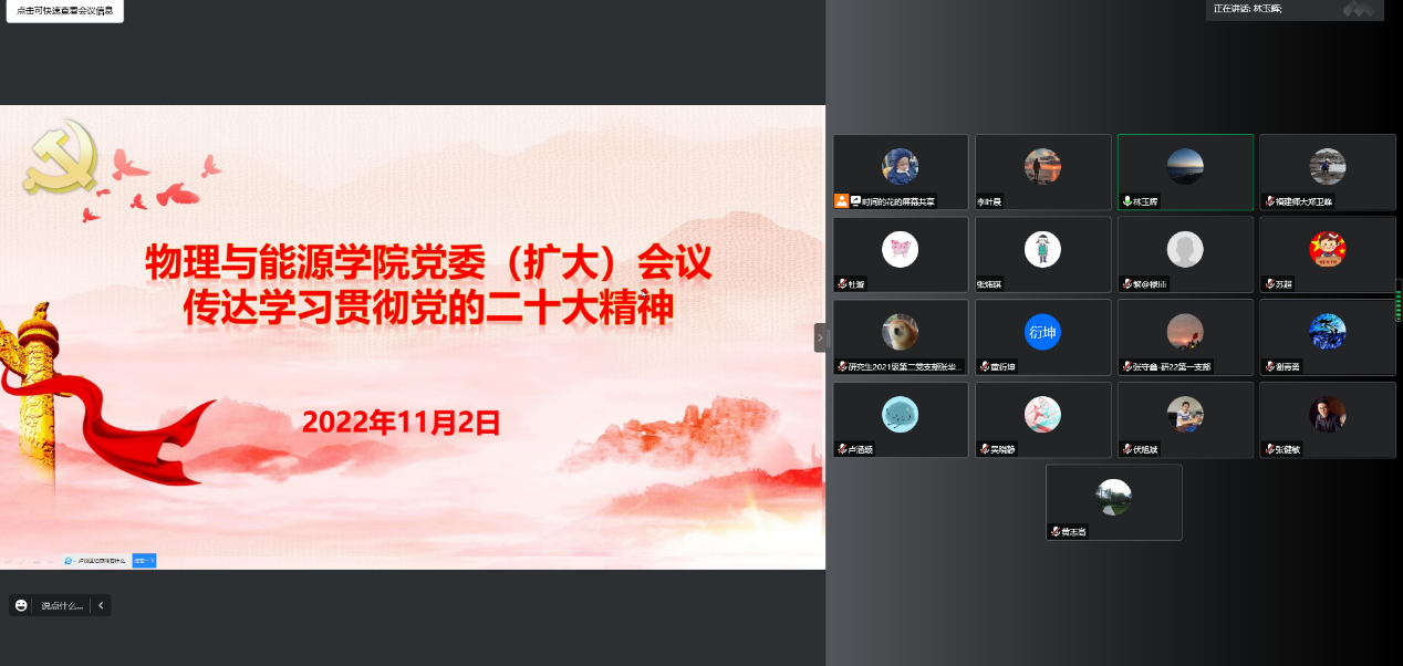11月2日,学院党委召开党委会(扩大)会议传达学习党的二十大精神,研究部署贯彻落实意见。会议采用线上方式进行,学院党委班子成员、党委组织员、各党支部书记、各年级辅导员参加会议。