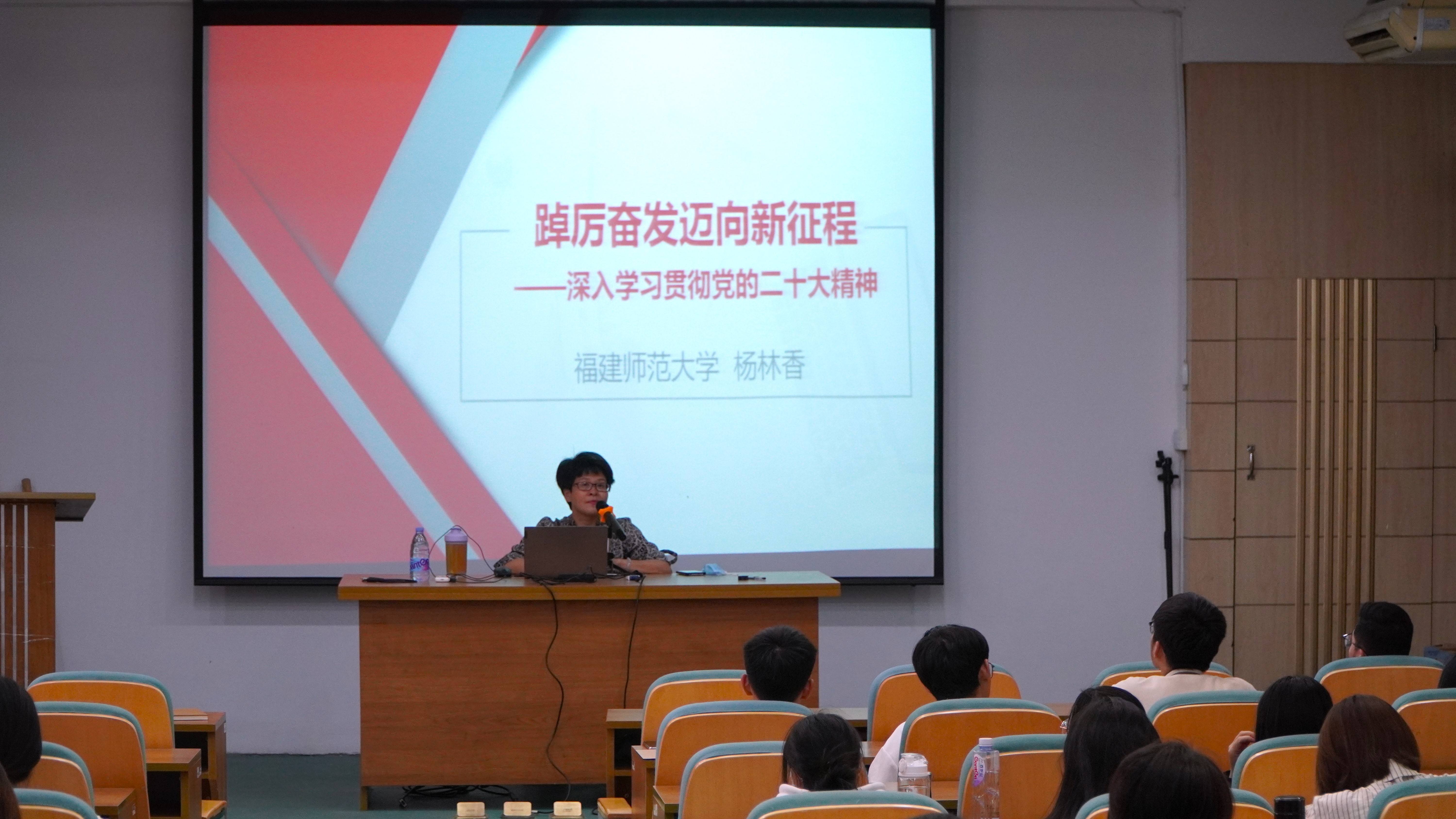 讲座会上,杨林香教授详细介绍了党的二十大概况,并对二十大报告的主要内容进行深入的解读。她表示理论要与时俱进,不断开辟马克思主义中国化时代化新境界;要加快构建新发展格局,着力推动高质量发展。杨林香教授希望同学们能够坚定理想信念,明确人生目标,以党的二十大精神为指引,踔厉奋发迈向新征程。
