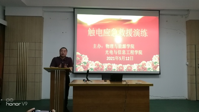 2021年5月12日,物理与能源学院和光电与信息工程学院联合开展实验室触电应急救援培训演练活动。两院党政领导、教师、研究生和本科生代表参加了此次培训演练活动。