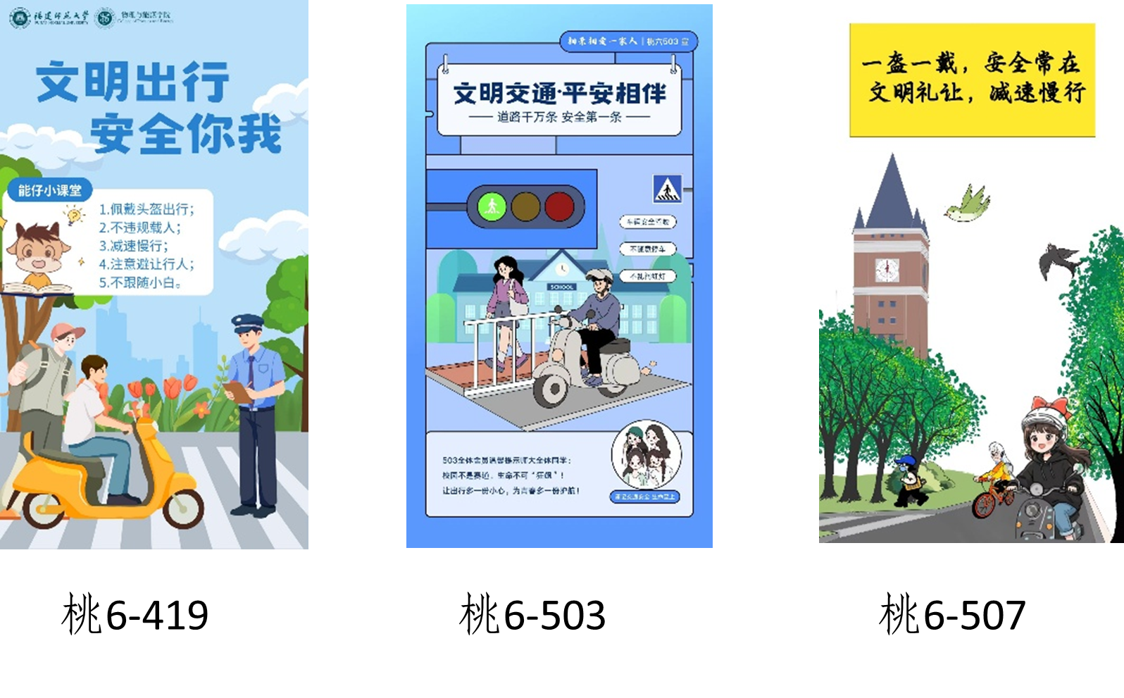 校园交通安全海报设计大赛创新融合知识传播与艺术表达。参赛作品既有学院IP“能仔小课堂”漫画,通过拟人化卡通形象讲解安全规范;也有“一盔一戴,安全常在”主题海报,用醒目标语构建视觉记忆点。同学们以独特的创意和鲜明的视觉语言,打造出一幅幅引人深思的宣传作品。
