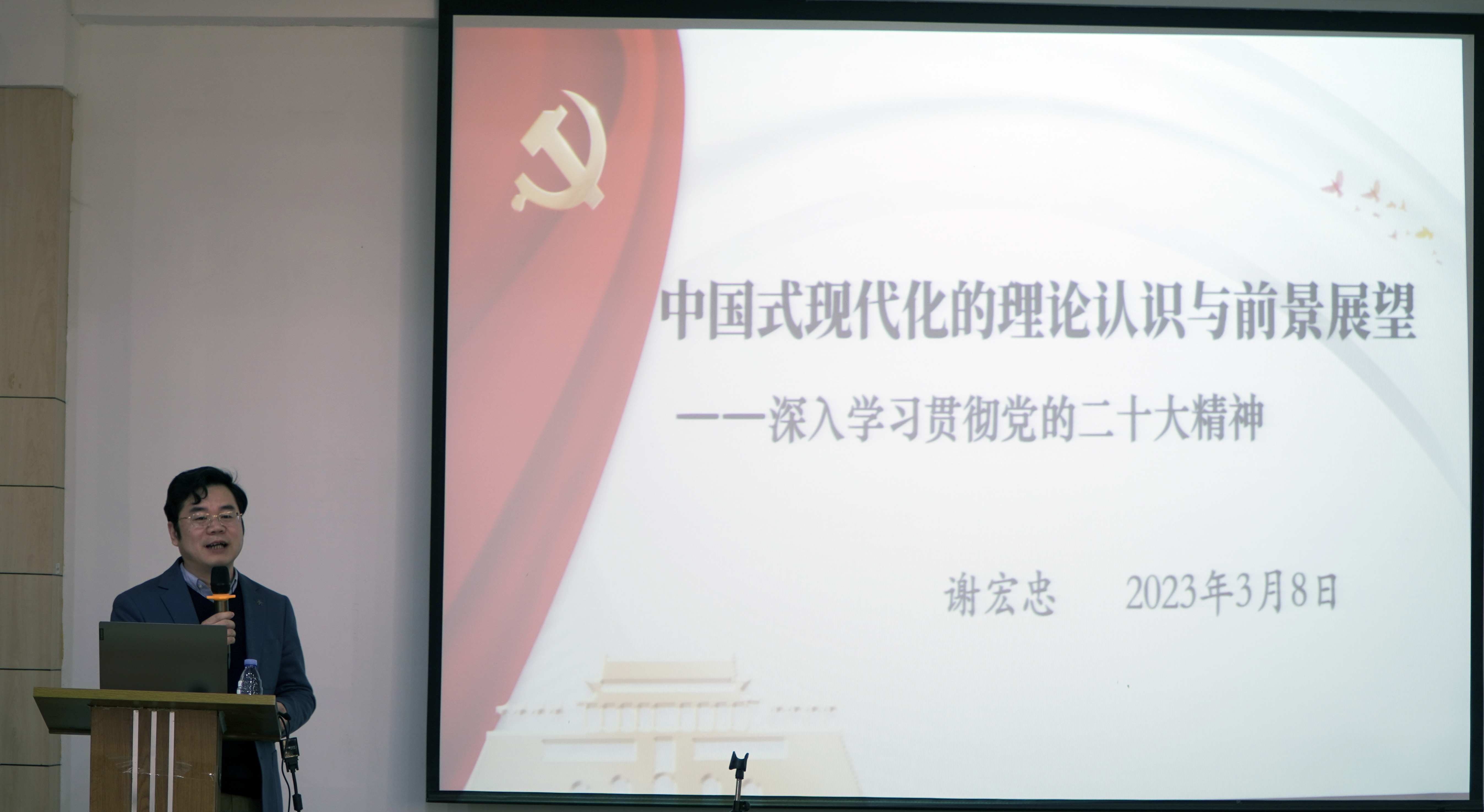 3月8日,我院邀请校学习贯彻党的二十大精神宣讲团成员、文化旅游与公共管理院长谢宏忠教授为全体教职工作题为《中国式现代化的理论认识与前景展望》的专题辅导报告。报告会由学院党委书记林玉辉主持。