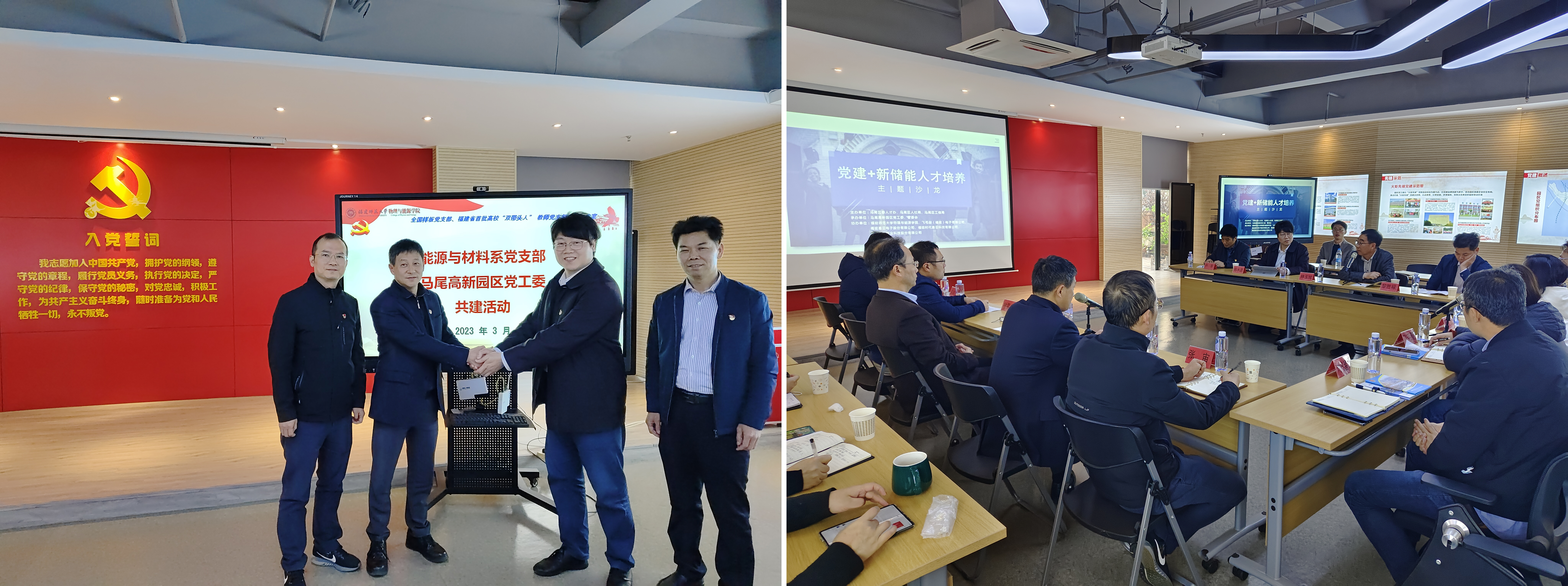 为充分发挥党建在人才培养工作中的引领作用。近日,我院能源与材料系党支部与马尾高新园区党工委联合开展“党建+新储能人才培养”主题沙龙活动,活动在马尾高新园区火炬先锋党群活动中心举行。我院能源与材料系党支部书记、副院长陈水源,支部成员、学院党委副书记黎胜禄,马尾区人才办、人社局、工信局相关领导,马尾高新园区党工委、管委会负责人及部分高新园区企业负责人参加了活动。