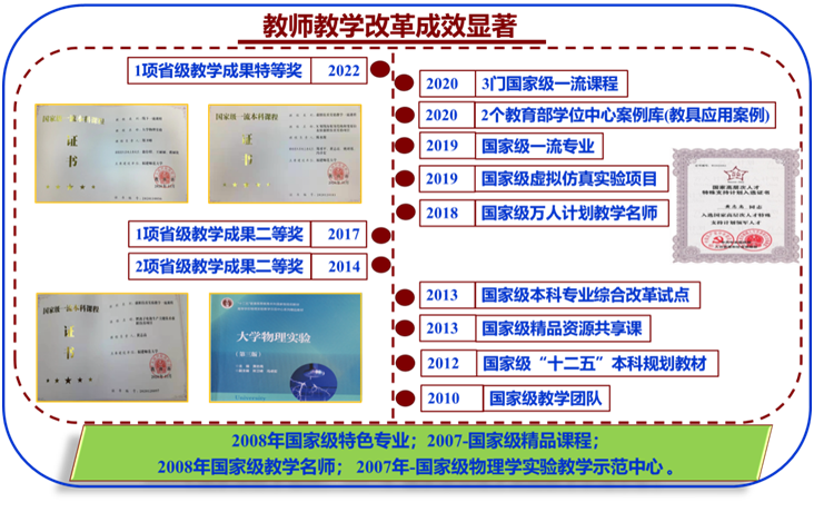 项目提出“三三三三” 实践能力提升新模式,通过《中学物理实验教学研究》《教具设计与制作》和《物理教学技能训练》三门交叉融合课程,分层次开发214类国内独一无二的创新教具及121个教学案例,其教学应用效果良好。学生在各类全国竞赛中屡获佳绩,在师范院校中名列前茅;先后获得11项国家级教学名师、一流专业、教学团队、一流课程和规划教材等;师生发表教改论文291篇;出版5本教材。