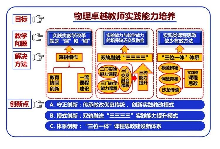 成果发扬“深耕细作”精神,在“深、细、实、真”上下功夫,深入中学开展教育协同创新,深耕课程建设,细作教学改革,创新性地提出融合交叉实验能力与教学能力培养的双轨融进教改模式,以层次化、螺旋式为指导开发了系列创新教具并应用于课堂教学实践,实现学生教学能力提升;创新“模范树德、课程育德和沙龙传德”三位一体实践类课程思政建设体系,突出薪火相传,塑造出“深耕细作、敬业奉献”的实践教学团队文化。