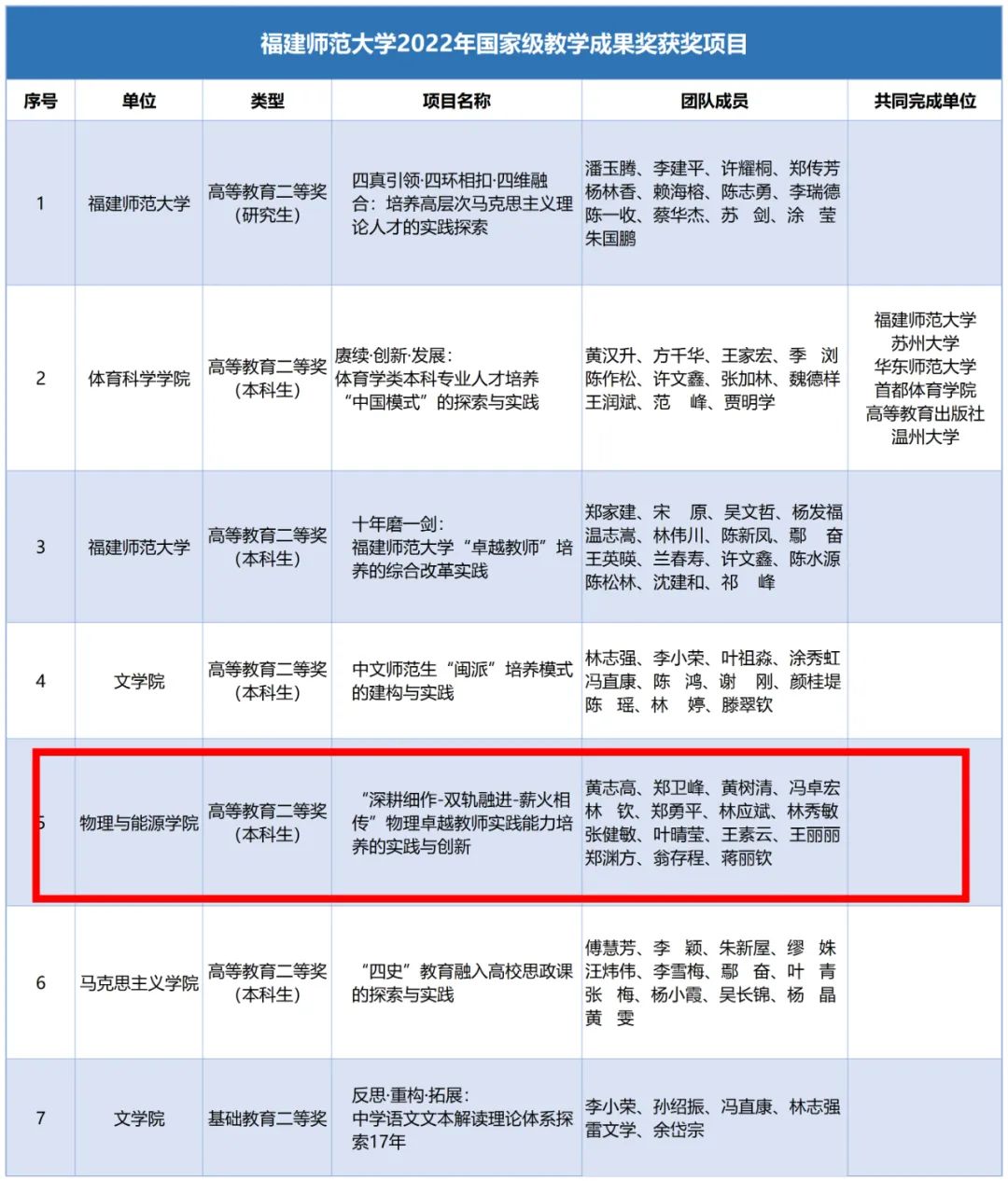 近日,教育部公布了2022年国家级教学成果奖获奖名单,由物理与能源学院黄志高教授牵头完成的《“深耕细作—双轨融进—薪火相传”物理卓越教师实践能力培养的实践与创新》,荣获高等教育(本科生)教学成果二等奖。