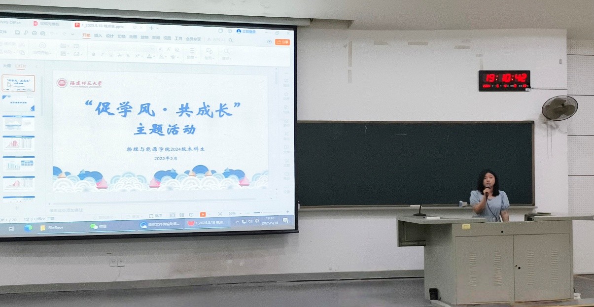 5月18日,物理与能源学院2024级本科生在知明2-102召开了学风建设专题教育晚点名暨期末学业提升指导会。辅导员蔡绮谣系统分析了各专业学情,指出共性问题。会议邀请了优秀学生代表分享备考经验,发挥榜样引领作用。辅导员随后提出了加强笔记整理、系统复习错题等“五项行动计划”,并介绍了“一对一”学业帮扶机制,鼓励同学们主动寻求帮助,科学备考。本次会议内容详实,指导性强,有效增强了学生的学习主动性与规划意识,为营造优良学风、助力期末冲刺奠定了坚实基础。