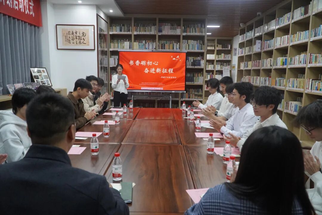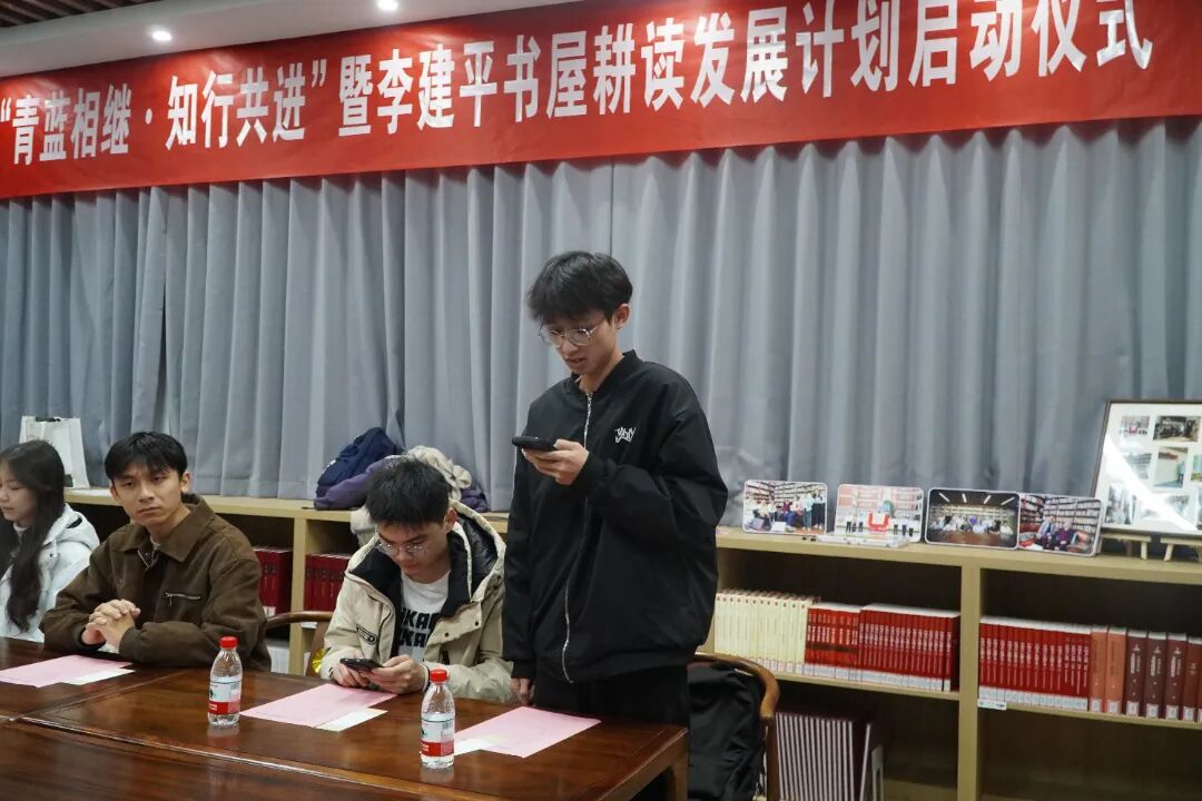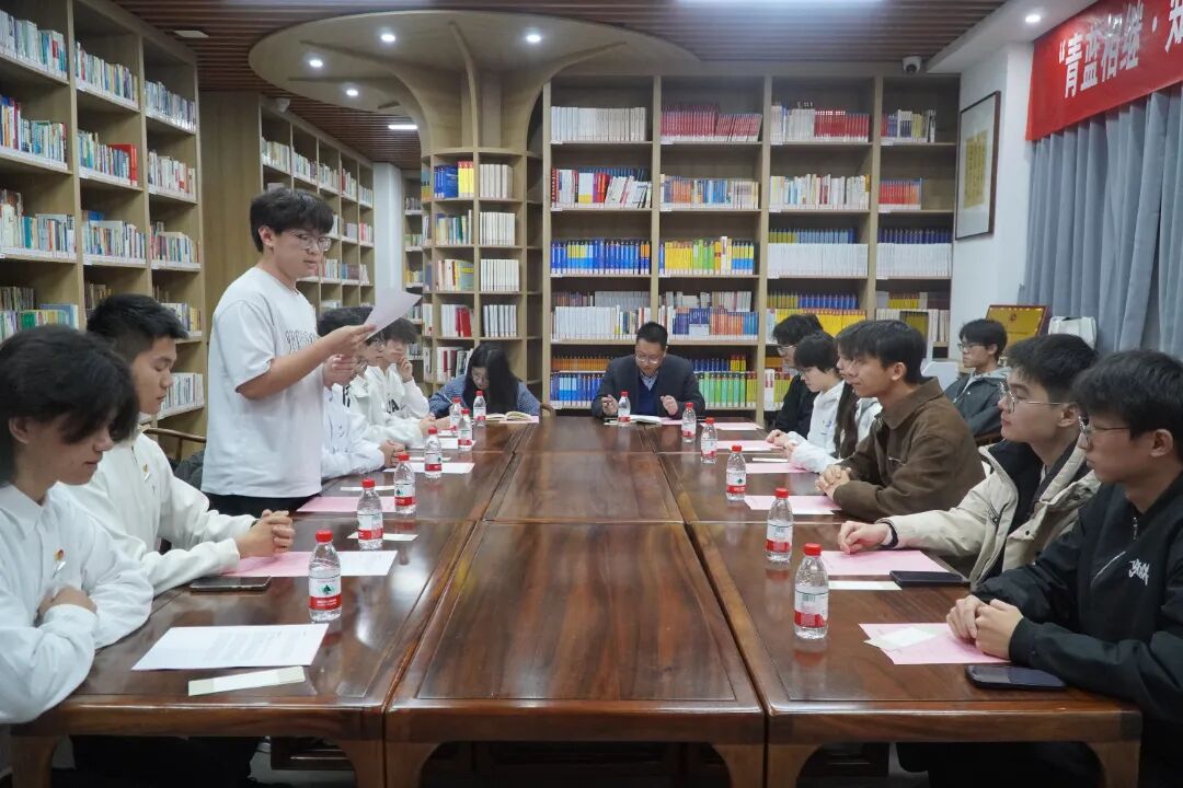 在交流探讨环节,阮学旺结合李建平书屋的育人初心与团立项活动的实践意义,围绕“青年成长与经典阅读”展开分享。他强调,人文素养是科技创新的重要基石,希望青年学子从经典著作中汲取砥砺奋进的精神力量,在专业书籍里夯实探索未知的知识根基,涵养人文素养、跨界融合创新、接续艰苦奋斗,将阅读所得转化为成长成才的动力。杨君火对学院师生的到来表示欢迎,简要介绍了李建平教授的育人事迹与李建平书屋的突出特色,并勉励大家在日常学习中注重学科交叉融合、培育经典阅读能力。
