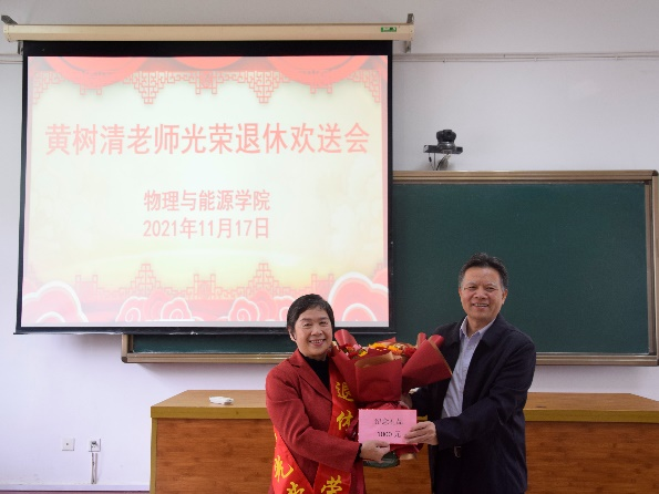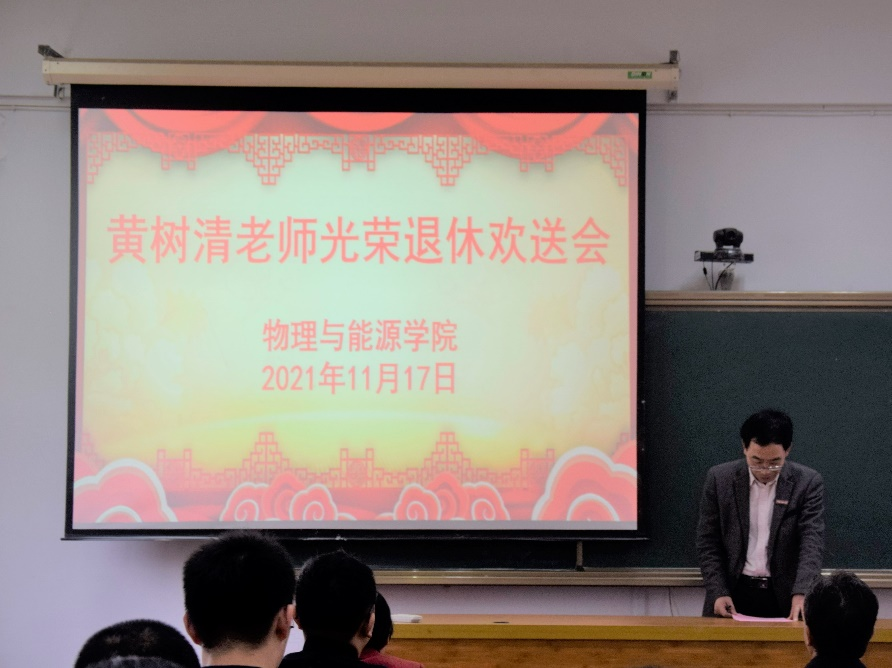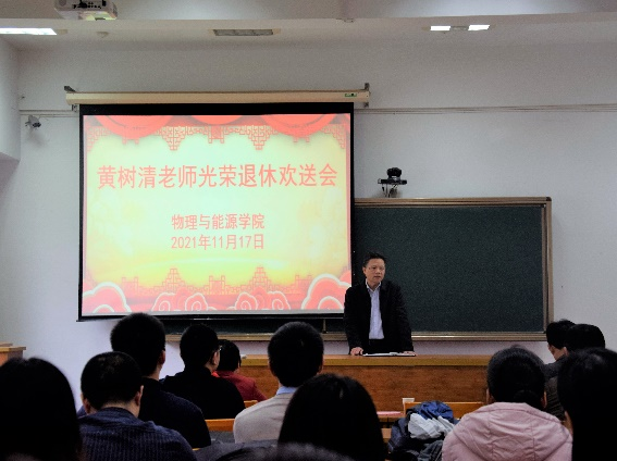 11月17日下午,物理与能源学院在理工楼3-303会议室举行黄树清老师光荣退休欢送会,以表达对退休教师的感谢与敬意。欢送会由林玉辉书记主持,学院党政领导、院工会委员、部分教师代表和学生代表参加。