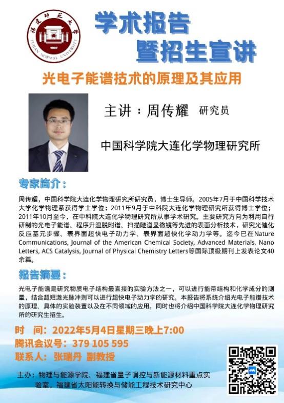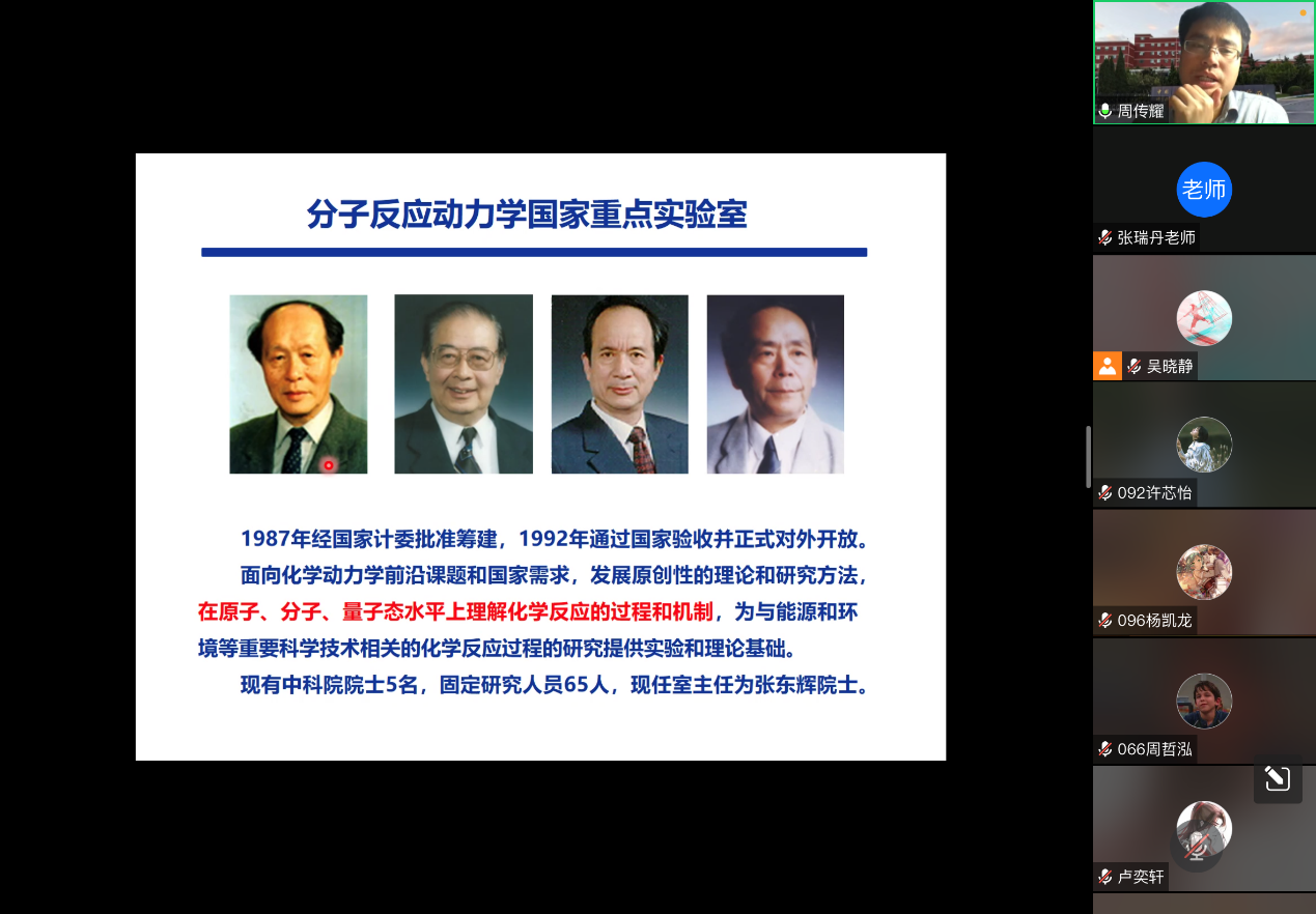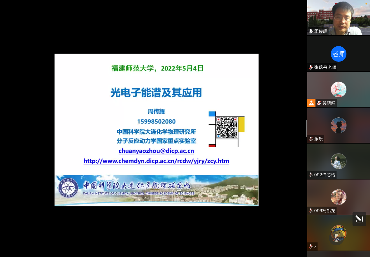 2022年5月4日,我院特别邀请中国科学院大连化学物理所分子反应动力学国家重点实验室的周传耀研究员开展《光电子能谱技术的原理及其应用》学术报告暨招生宣讲。该讲座通过腾讯会议在线上举行,由我院张瑞丹副教授主持,我院2019级本科生及部分研究生参加本次讲座。