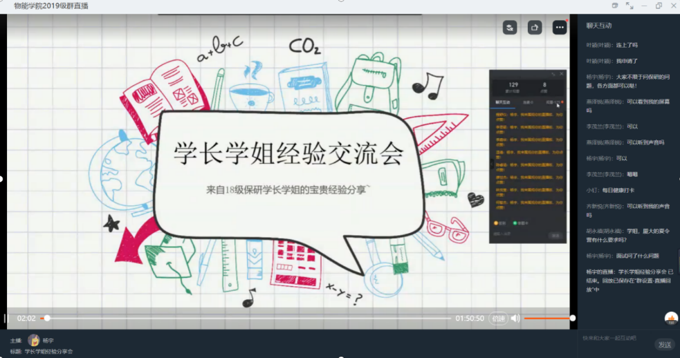 传经送宝,更上一层。在疫情期间,我院通过钉钉群直播平台,开设“考研分享会”直播,邀请2018级保研考研成功的学长学姐畅谈学习心得、考研经验。