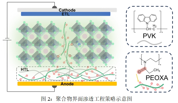 本研究在全溶液法制备的f‑PeLEDs中引入聚合物界面渗透策略,有效解决了传统空穴传输层与钙钛矿层之间因力学性能不匹配、界面缺陷多而导致的性能损失问题。聚合物结构中的羰基能够与钙钛矿中的Pb2⁺及有机阳离子形成多重配位作用,同时聚合物网络结构显著降低了薄膜的杨氏模量,从而实现缺陷钝化与柔性增强的协同效应。该策略为开发高效率、高稳定性的钙钛矿光电器件提供了一种通用且简便的途径。