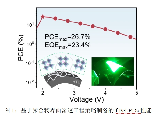 针对上述挑战,我院陈大钦教授团队开发出一种聚合物界面渗透工程策略:将聚(2-乙基-2-噁唑啉)掺入空穴传输层,并通过旋涂法使其在空穴传输层与发光层之间形成三维互穿网络结构,从而同步实现了缺陷钝化与杨氏模量匹配。基于该策略,所制备的绿光f‑PeLEDs取得了23.4%的外量子效率和26.7%的功率转换效率,均为目前文献报道的最高值之一;此外,推算其在100 cd/m2亮度下的半衰期长达1380小时。所得器件在连续弯曲4500次后,仍能保持80%的初始效率,并成功实现了4 cm2的大面积制备,显示出良好的规模化应用前景。