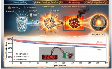 针对硅碳负极中的SiOx材料电导率低、循环过程中结构应力导致电极粉化及SEI膜不稳定等问题,我院李加新教授、黄志高教授课题组创新提出“液相砂磨–机械振实融合–固相烧结”策略,成功合成了石墨负载SiOx@C-TiO2负极材料。该策略巧妙结合液相与固相工艺优势,解决了宏量制备中纳米颗粒分散与结构稳定性的矛盾;利用廉价原料与可放大机械处理,显著降低了成本与制备复杂度;同时,TiO2协同非晶碳的多功能复合包覆层设计,有效抑制了体积膨胀应力,提升了界面稳定性和电子传导。