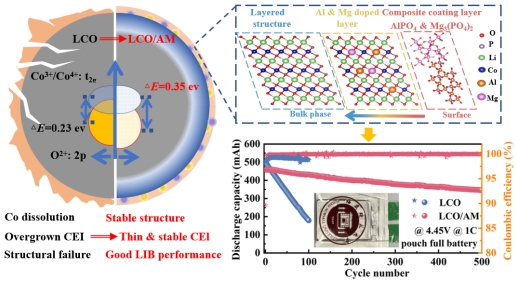 针对高压条件下钴酸锂(LiCoO2)存在的氧损失、结构相变和界面腐蚀等多尺度退化难题,我院李加新、黄志高教授团队创新开发出Mg3(PO4)2/AlPO4双涂层结合Al/Mg表面共掺杂的双重改性策略。该策略通过调控Co-O轨道杂化、构建快速离子通道,从根源上抑制氧释放与界面副反应,显著提升了材料在高压下的循环稳定性。改性后的LCO/AM正极材料展现出卓越性能:在4.45 V电压下循环1000次后容量保持率达78%;4.55 V下循环300次后仍能提供145.5 mAh g⁻¹的比容量。基于该正极组装的480 mAh软包全电池同样表现出出色的电化学性能和热安全性能,为高压钴酸锂的实际应用提供了低风险、经济有效的技术路径。