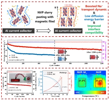 针对NASICON型磷酸钒钠(Na3V2(PO4)3,NVP)电子电导率低、钠离子扩散动力学缓慢导致的循环寿命和倍率性能恶化问题,我院李加新、黄志高教授团队提出了一种具有强工业兼容性的磁场诱导晶相优选取向策略,可以有效改善电极电导、离子扩散动力学和界面兼容性,提高了其软包全电池的电化学储钠性能和热安全特性。